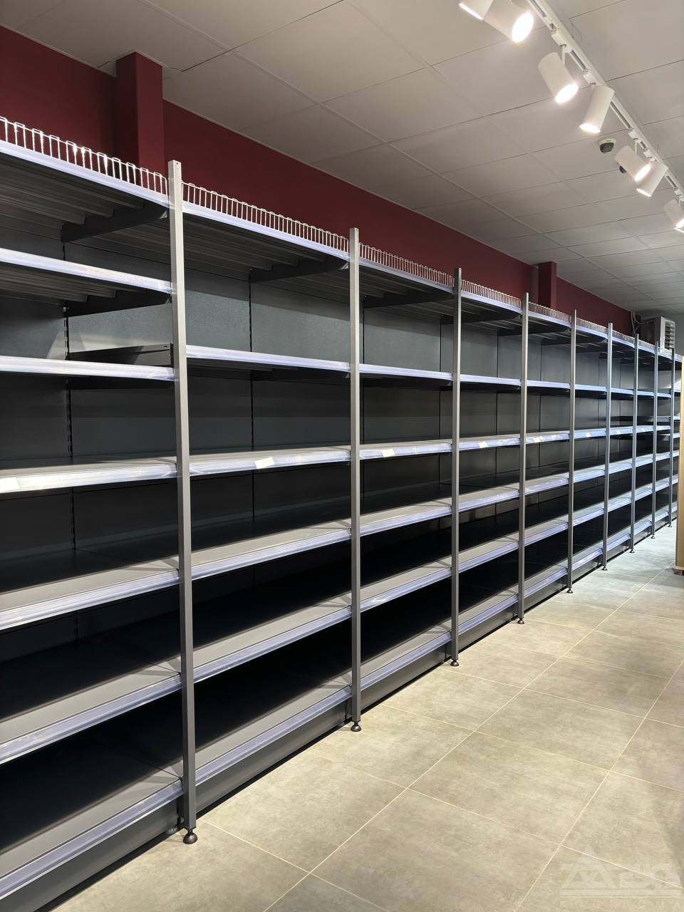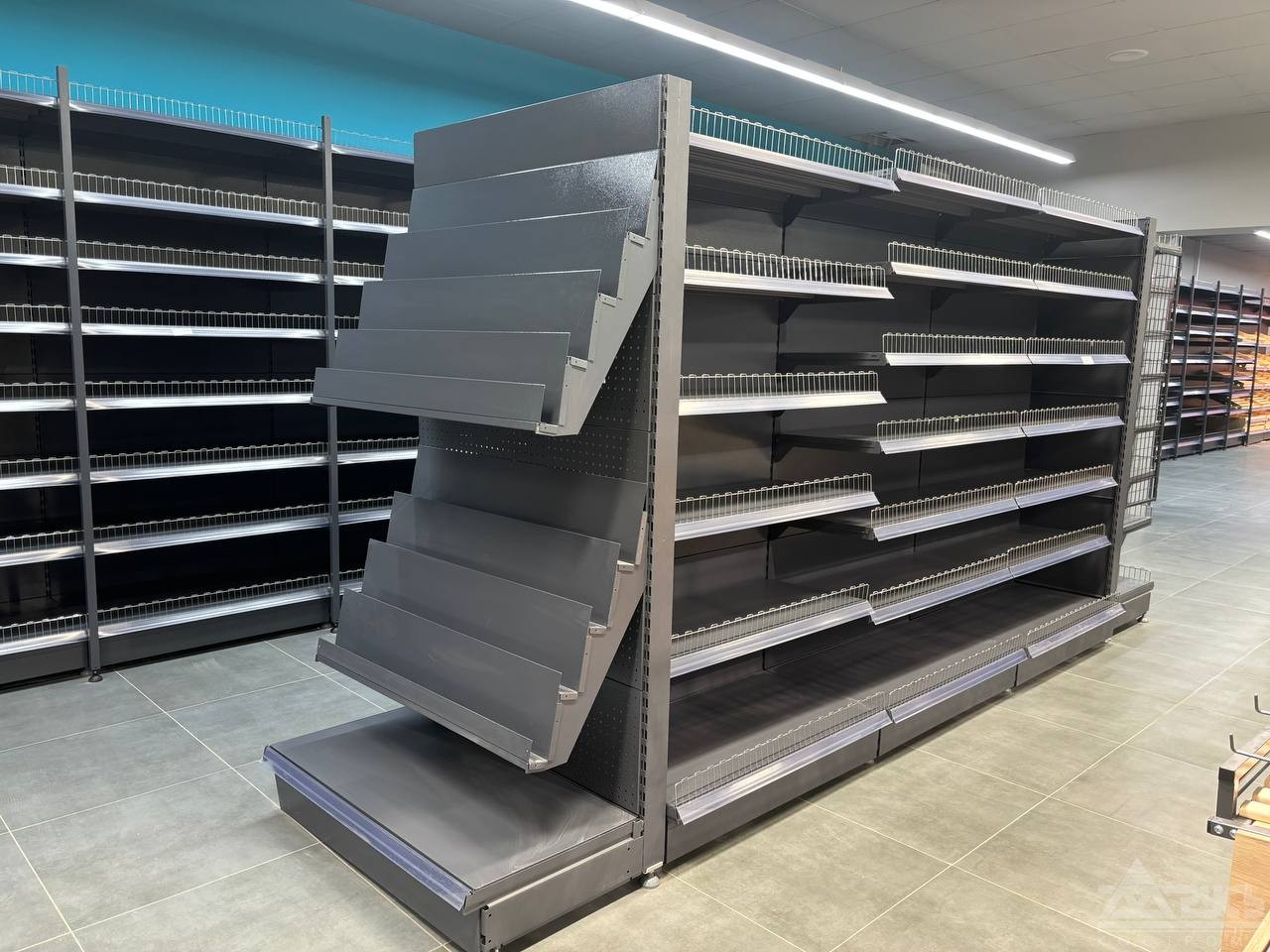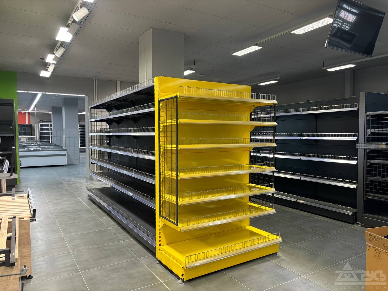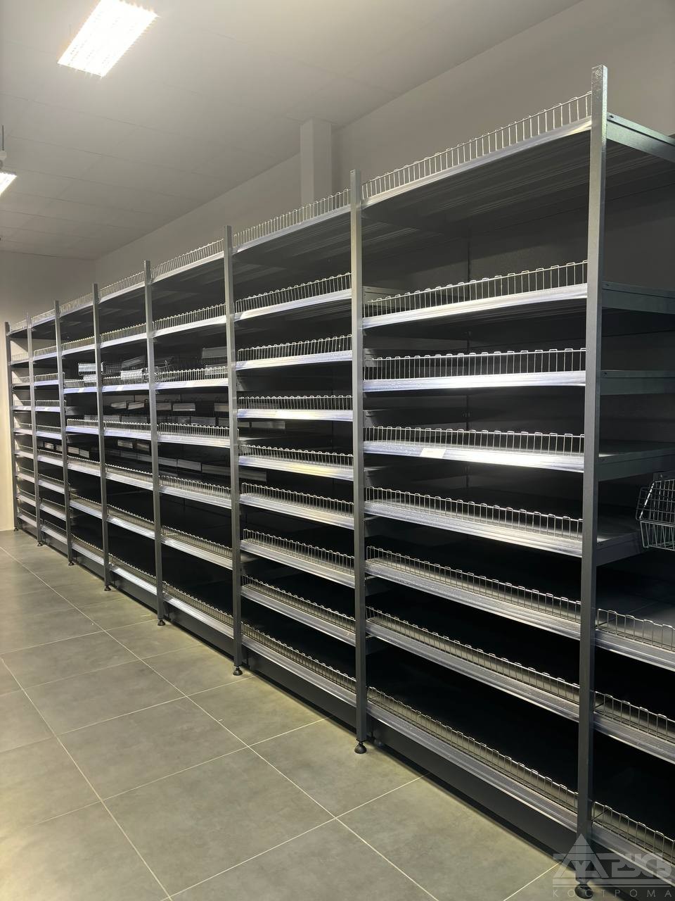 Установка стеллажей: Смонтированы стеллажи серии СК, включая модель СК с передней стойкой, для эффективной выкладки товаров.