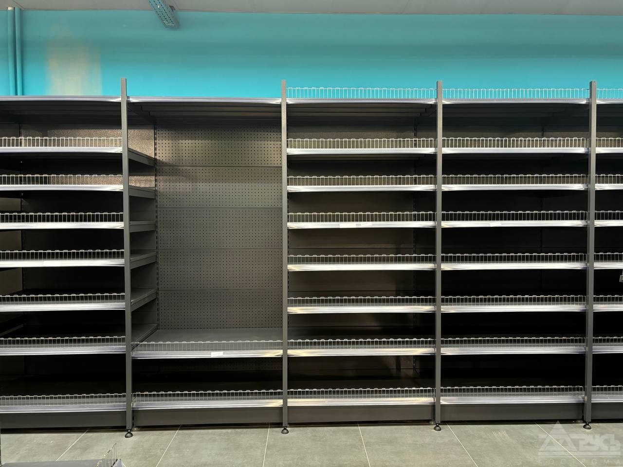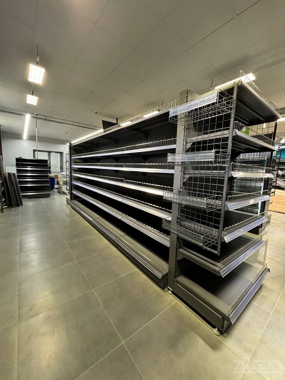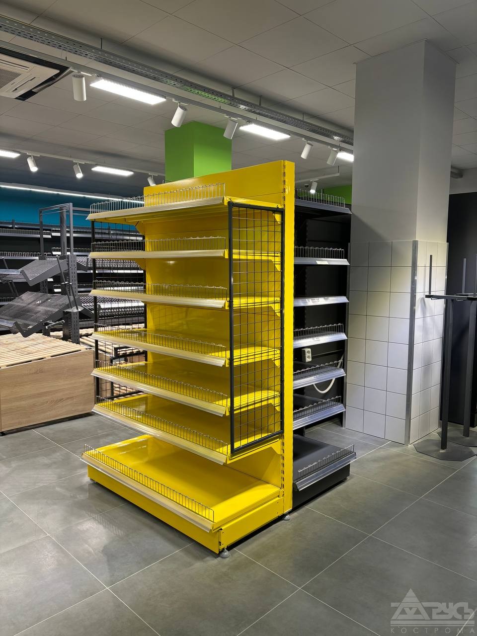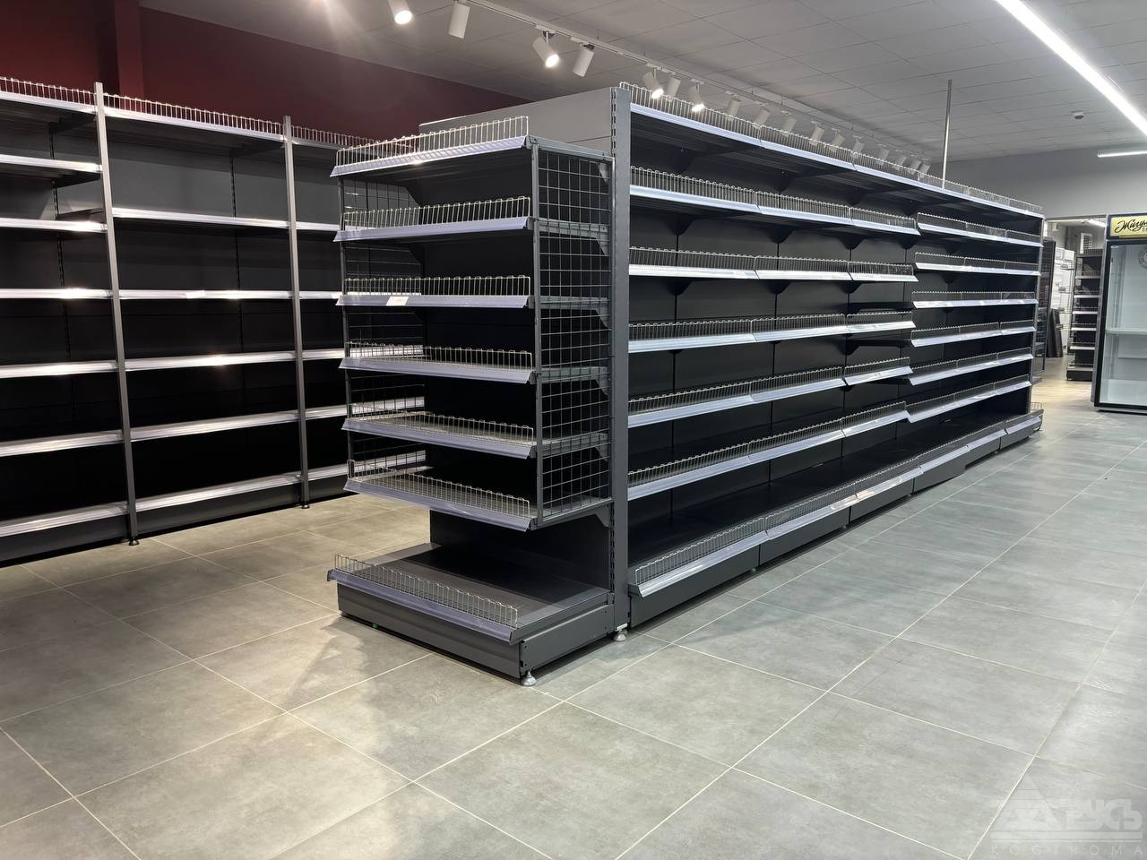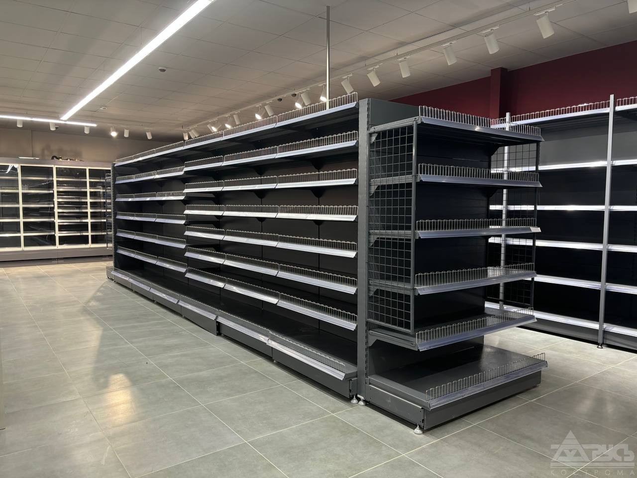 Установка стеллажей: Смонтированы стеллажи серии СК, включая модель СК с передней стойкой, для эффективной выкладки товаров.