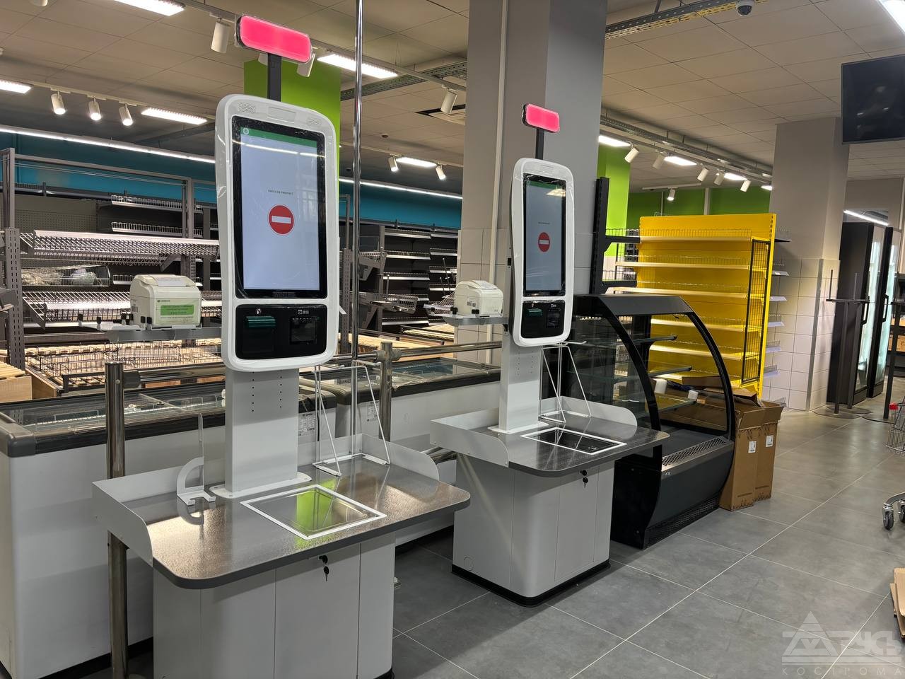 Оснащение расчетной зоны: Собраны и установлены тумбы для касс самообслуживания.